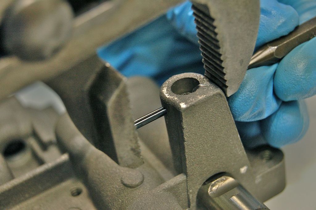 Use a small punch to hold the spring into place while the pin is drawn over the spring by pliers.